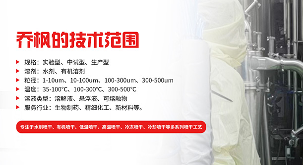 上海喬楓實業有限公司,成立于2012年,是從事噴霧干燥設備的研發設計、生產、銷售(小型噴霧干燥機,實驗型噴霧干燥機,35℃低溫噴霧干燥機有機溶劑噴霧干燥機,低溫閉式循環噴霧干燥機、超細粉末噴霧干燥機、噴霧冷凍干燥機、真空噴霧干燥機、氣流噴霧干燥機,噴霧造粒干燥機,離心噴霧干燥機,沸騰制粒機等)和售后于一體的綜合性公司,本公司現成為一家致力于為生物制藥、精細化工、新能源、陶瓷造粒及食品工程等領域提供全套解決方案的整線交鑰匙工程企業。
